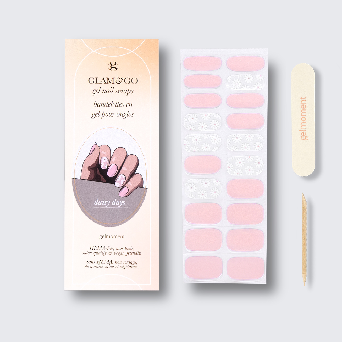 Plus, not only do GLAM & GO gel nail wraps provide the same glossy finish you know and love from our regular gel polish, but they are also HEMA FREE and have a wear time of up to 14+ days.