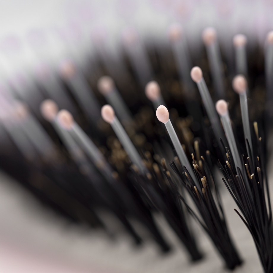 Bristles - made of a premium nylon and boar hair mix to help enhance shine and reduce frizz. With special epoxy ball point tips and a soft, air-filled cushion that helps ensure an easy, pain free brushing and static free hair every time.